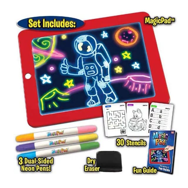 [BIG SET] The set includes: Magic Board, 3 Dual-Sided Neon Pens, Dry Eraser, Glow Boost card, 30 Stencils, Fun guide.